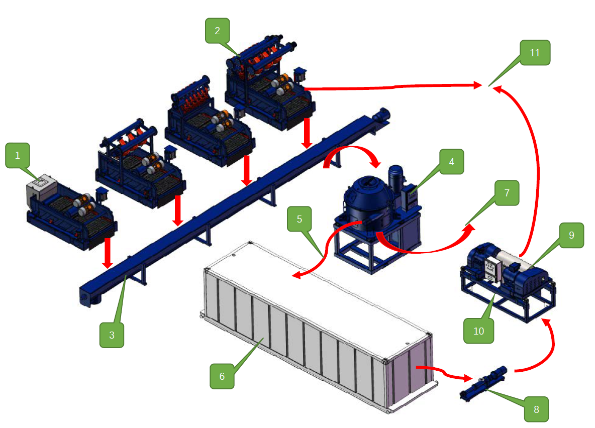 鉆機(jī)過來的泥漿通過高架管匯進(jìn)入振動(dòng)篩(1)、泥漿清潔器(2),經(jīng)過(1)、(2)處理排放的鉆屑通過螺旋輸送器(3)輸送至鉆屑干燥機(jī)(4)處理。鉆屑干燥機(jī)處理完的固體通過廢渣(7)排出,回收到的鉆井泥漿(5)進(jìn)入鉆井液泥漿罐(6),離心機(jī)供液泵或者螺桿泵(8)抽取含有細(xì)固顆粒的回收泥漿,供給離心機(jī)(9)處理,固體部分通過固體排渣口(10)排出,處理完成的鉆井液通過干凈泥漿回歸泥漿系統(tǒng)(11)。