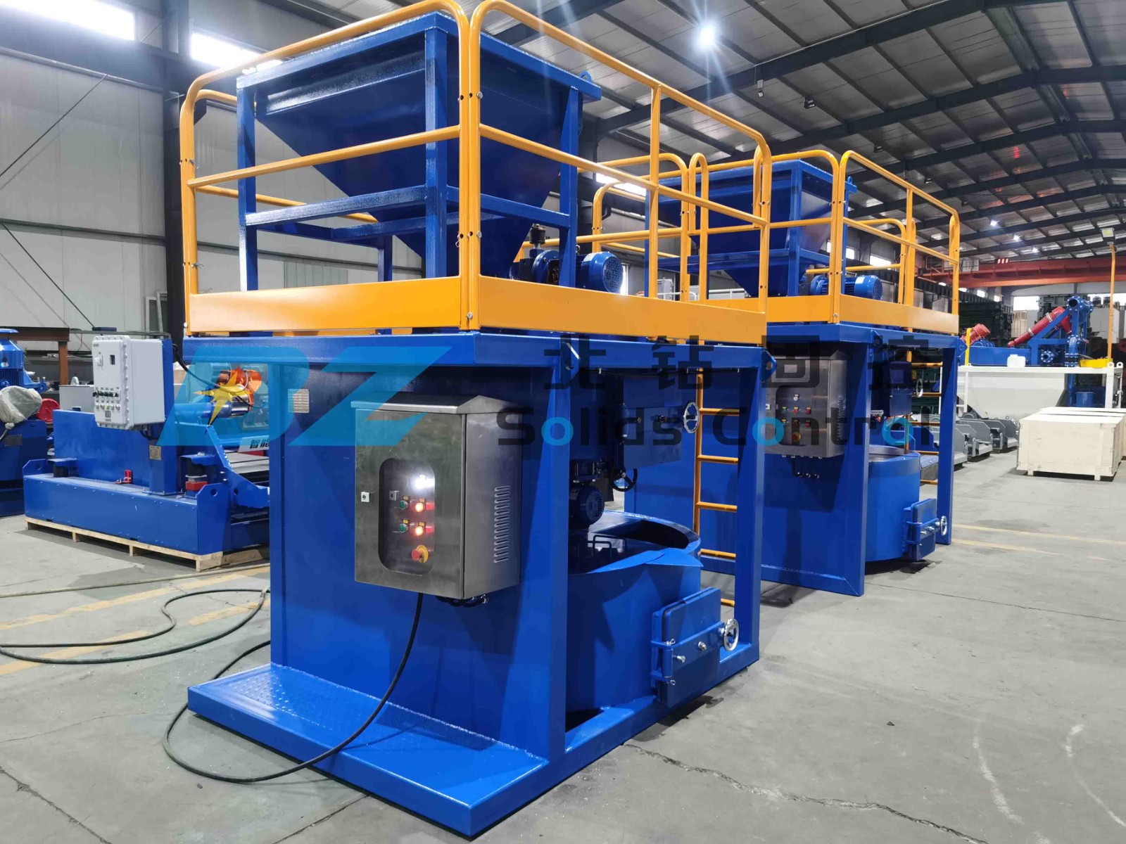 此混合攪拌裝置為北鉆固控技術人員結合終端客戶的技術要求非標定制化的兩套混合攪拌系統(tǒng),可以實現粉狀物料和液相物料的充分混合攪拌及自動投加,混合攪拌速度及物料配比精度可完全滿足并超過客戶的基本要求。